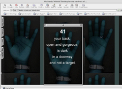 <http://obadike.tripod.com/Adiallo2.html > my hands/wishful thinking is an internet memorial piece for Amadou Diallo. Diallo was killed by new york city policemen on february 5, 1999. the four policemen involved claimed that they thought Diallo's wallet was a gun and fired 41 shots, hitting him 19 times. most of the information we received about Diallo's death was mediated by the internet and filtered through the lens of our browser. we thought it fitting that we mourn and make art in this public/private digital space. keith's wallet, seen in the image, was purchased on 125th street in harlem where Amadou Diallo worked as a vendor. in this piece there is one thought to counteract each bullet fired. the words are wishful thinking in the present tense. these thoughts reject the negative forces directed against us, the survivors, african people in the united states. making this work is an enactment of our will to survive. Ê keith + mendi obadike this site requires a real player and a java capable browser. the site is best viewed with netscape communicator. click here to download a free real player. an early version of this piece was published on a cd-rom of "offline net.art" for the exhibition infos 2000 in slovenia. this exhibition was curated by tim murray from ctheory.net and teo spiller.